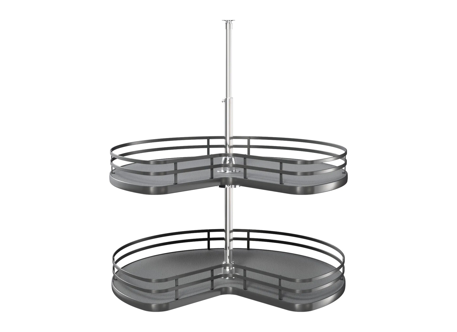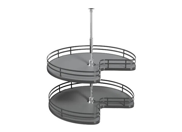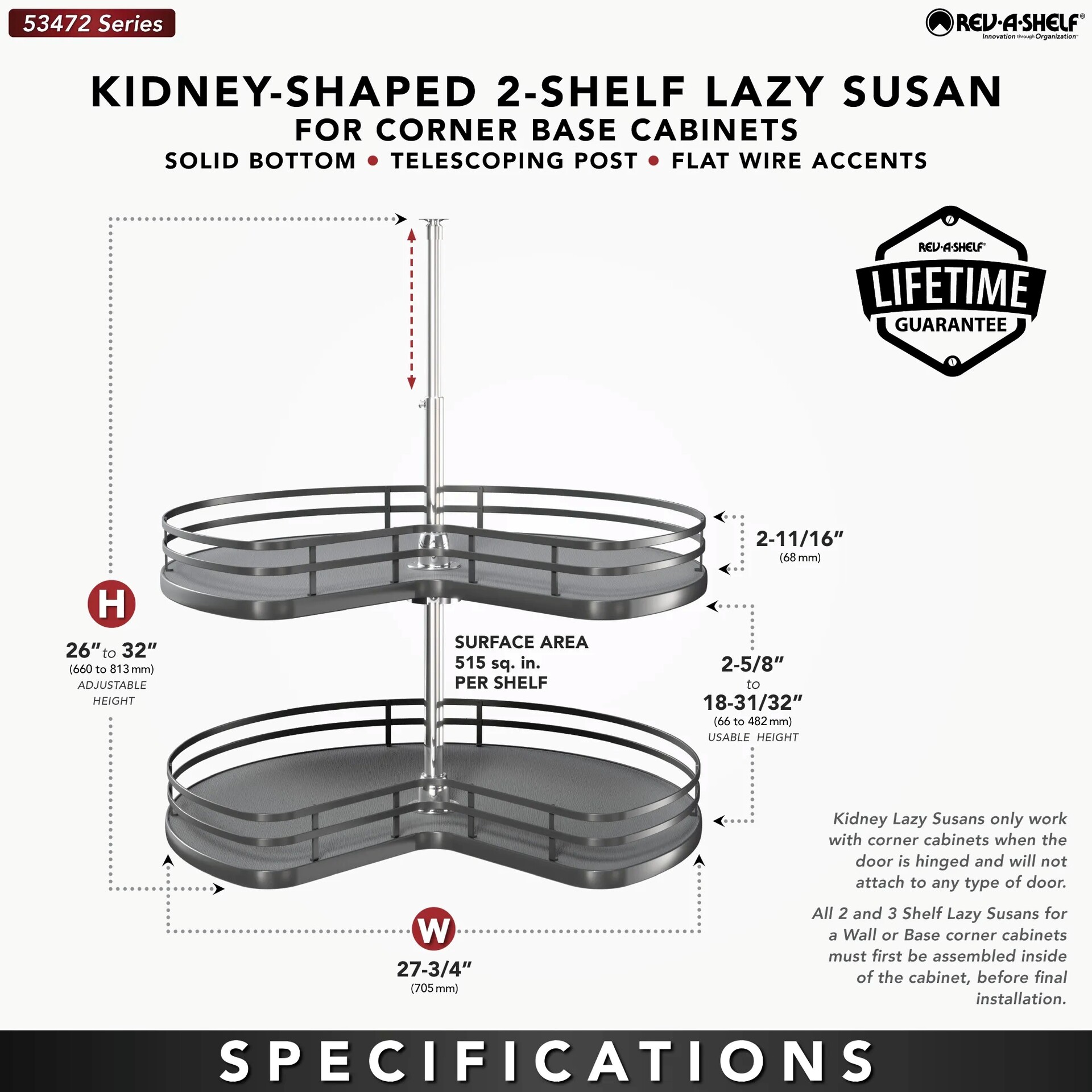 Make the most of that tricky corner cabinet space with the Rev-A-Shelf® 53-472 Series Solid Bottom Two-Tier Kidney-Shaped Lazy Susan. Available in two sizes, these two-tier Lazy Susans include a telescoping shaft with independently rotating hardware for a perfect fit and easy access to your angled corner cabinet. Choose from multiple stylish finishes!