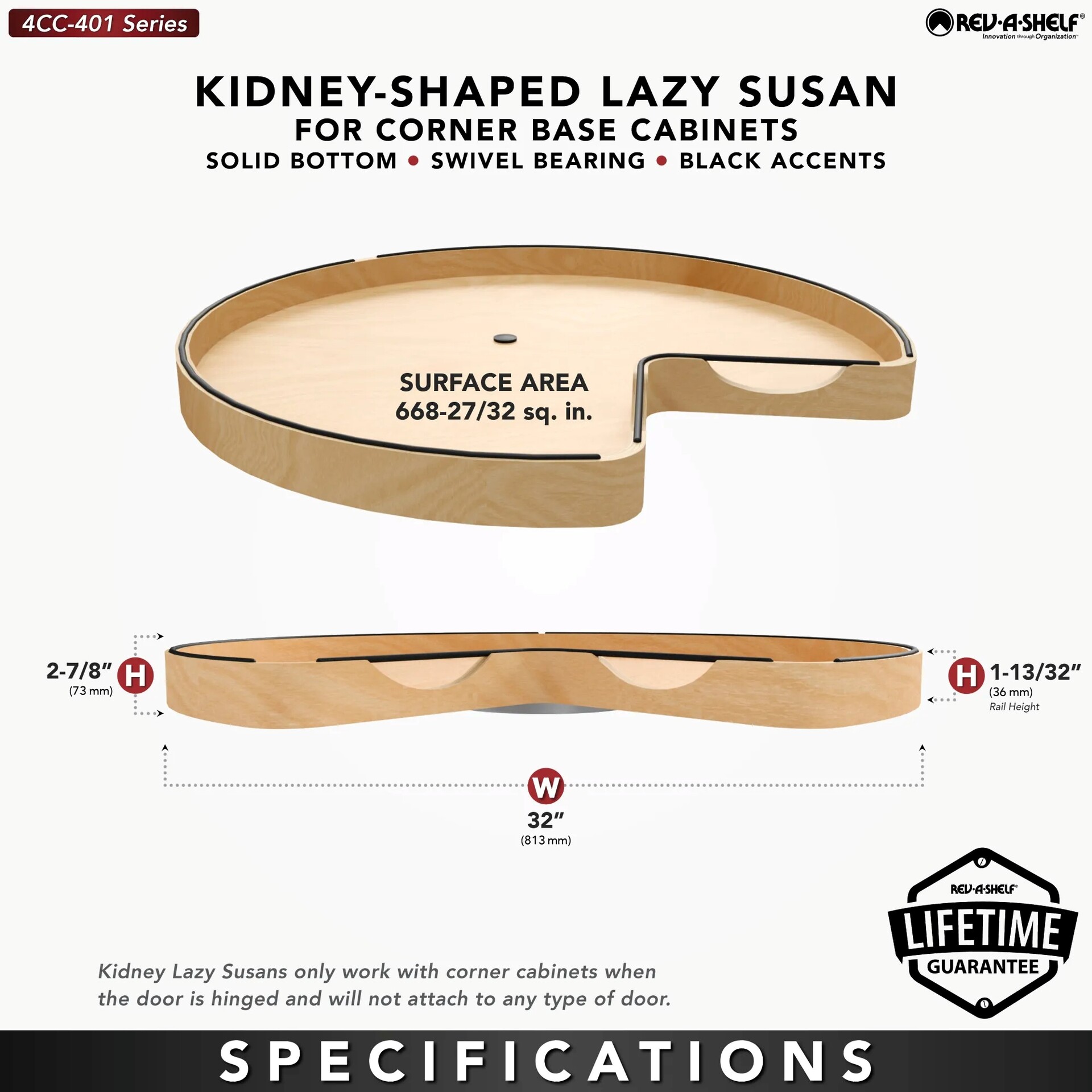 - Kidney-shaped lazy susans do not attach to the cabinet door