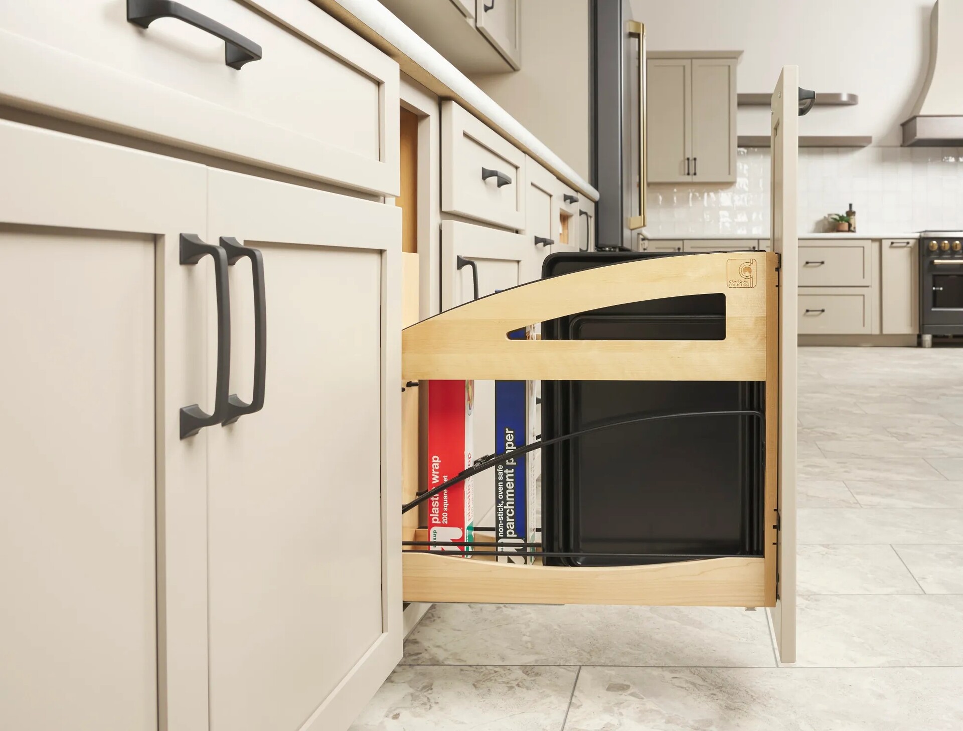 Organizing bakeware like cutting boards, trays, foil and plastic wrap doesn't have to be a chore. Make organizing fun with the Rev-A-Shelf® 447CC Craftsman Collection Base Cabinet Pullout. This organizer features that rich, distinctive Craftsman Collection look of visually appealing matte black round wire accents.
