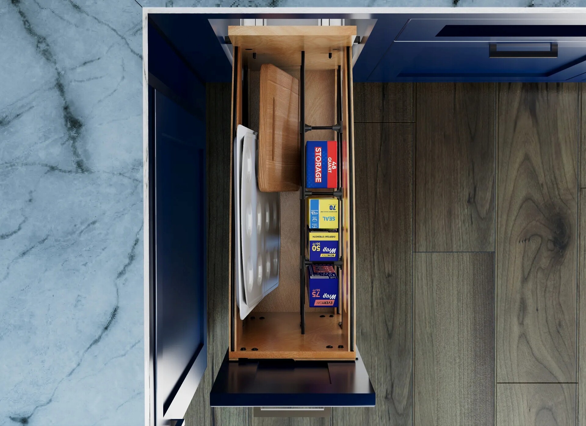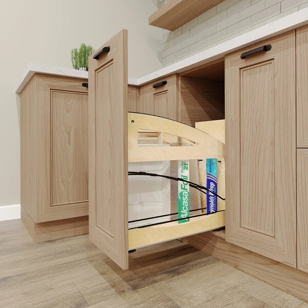 Organizing bakeware like cutting boards, trays, foil and plastic wrap doesn't have to be a chore. Make organizing fun with the Rev-A-Shelf® 447CC Craftsman Collection Base Cabinet Pullout. This organizer features that rich, distinctive Craftsman Collection look of visually appealing matte black round wire accents.