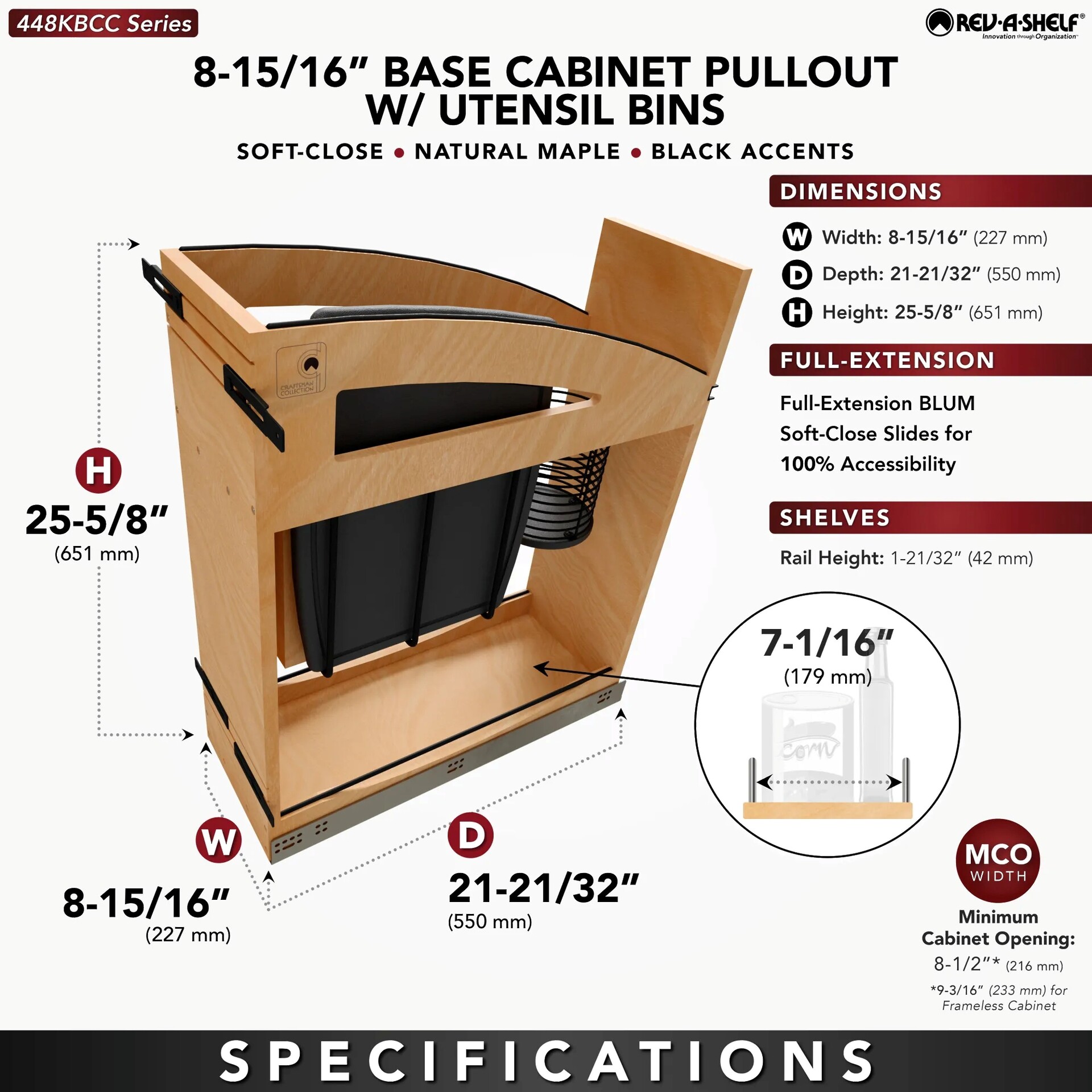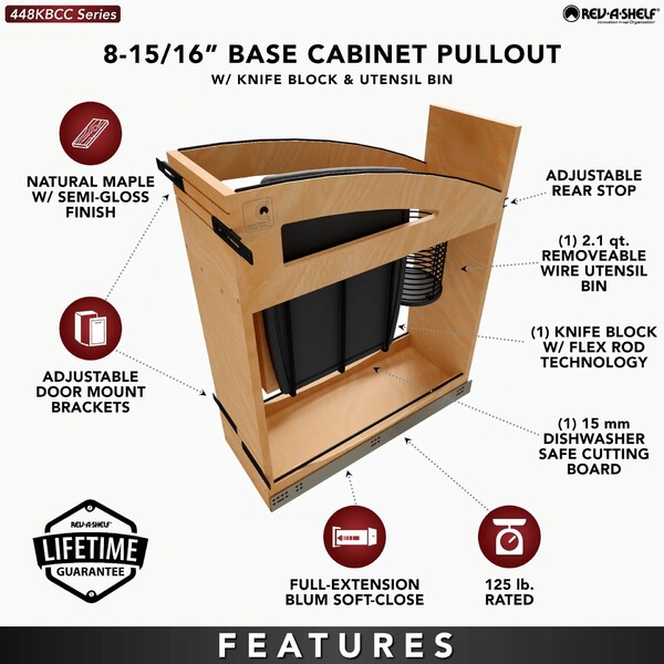Streamline your kitchen organization with the 448KBCC Craftsman Collection Knife Block Base Cabinet Pullout. This innovative pullout combines solid maple construction with gorgeous soft edges, curved black wire accents, a removable wire utensil bin and up to two knife block inserts with Flex Rod Technology for a secure and stylish way to store knives, shears, and more.