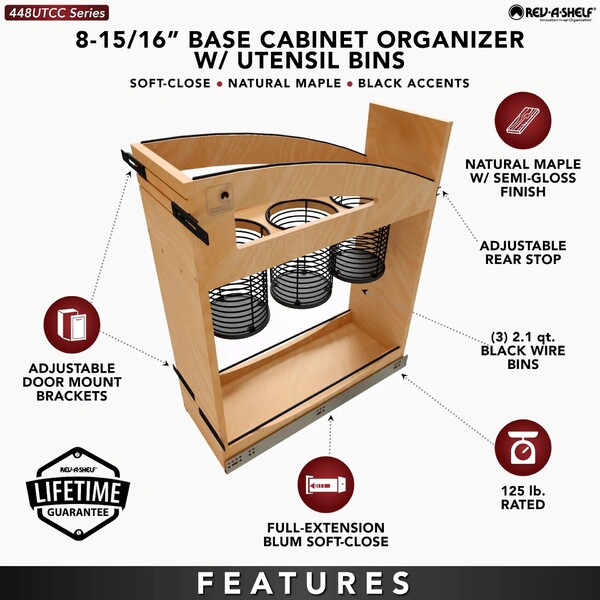 Keep your countertops organized and your kitchen coordinated with the 448UTCC Craftsman Collection Utensil Base Cabinet Pullout. Designed as part of our elegant Craftsman Collection, this organizer features solid maple construction, recessed black wire accents, and clean, soft lines. Available in two sizes, it includes a fixed upper shelf with up to four removable wire bins, a fixed lower shelf, and BLUM soft-close slides for smooth functionality.