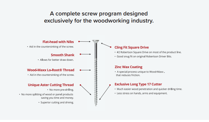 The Wood-Maxx is the ultimate wood screw. The specially designed cutting thread combined with our long T17 cutter eliminates the need for pre-drilling into most species of wood and sheet goods Quantity: 500