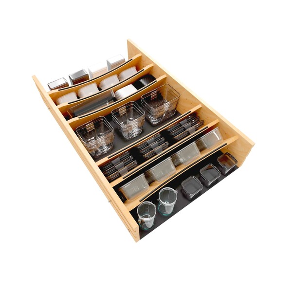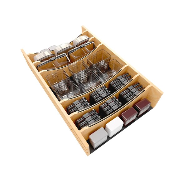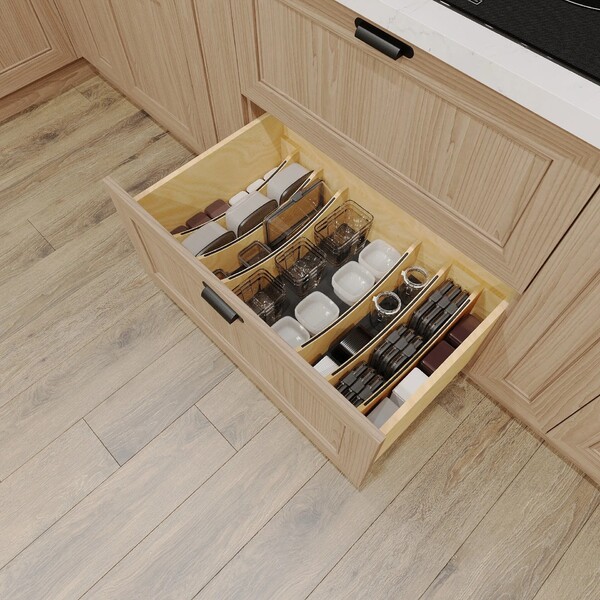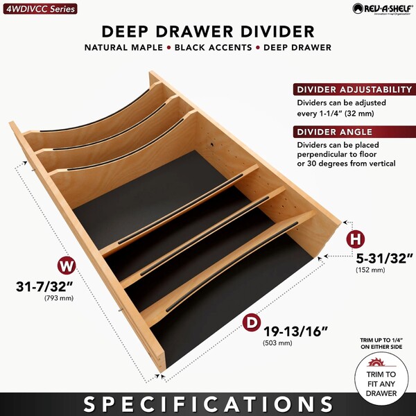 Are deep drawers driving you crazy? You are not alone! The 4WDIVCC Craftsman Collection Adjustable Deep Drawer Divider Inserts from Rev-A-Shelf® are sure to add organization without sacrificing style. Available in multiple trimmable sizes, these beautiful inserts feature solid maple construction and recessed black wire accents for a modern and refined appearance. The unique curved design seamlessly complements the rest of the Craftsman Collection while adding both visual interest and effortless access to the contents of the drawer. Installs in seconds with just four screws and includes up to six removable, adjustable dividers that can be positioned either at an angle or vertically, allowing you to create a truly customized organization solution.