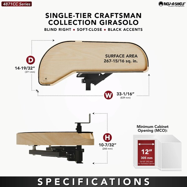 The 487CC Series Craftsman Collection "Girasolo" Blind Corner Optimizer by Rev-A-Shelf® offers a refined and sophisticated update to the classic Girasolo design. Crafted from maple with gracefully curved lines and soft edges, this innovative solution blends both elegance and practicality. The Girasolo glides effortlessly out of the cabinet on a soft-close pivot hardware system, eliminating the need for adjacent appliance clearance and maximizing accessibility. Designed for both right and left blind corner cabinet openings, it is available in multiple sizes and single or two-tier configurations, providing versatile storage options for hard-to-reach spaces.