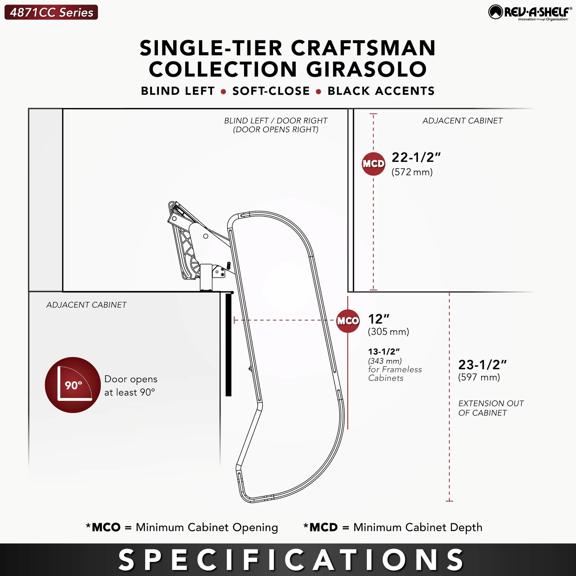 The 487CC Series Craftsman Collection "Girasolo" Blind Corner Optimizer by Rev-A-Shelf® offers a refined and sophisticated update to the classic Girasolo design. Crafted from maple with gracefully curved lines and soft edges, this innovative solution blends both elegance and practicality. The Girasolo glides effortlessly out of the cabinet on a soft-close pivot hardware system, eliminating the need for adjacent appliance clearance and maximizing accessibility. Designed for both right and left blind corner cabinet openings, it is available in multiple sizes and single or two-tier configurations, providing versatile storage options for hard-to-reach spaces.
