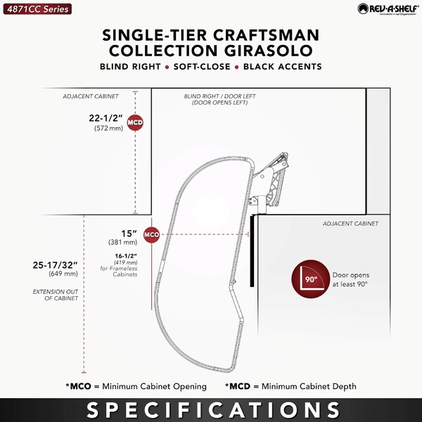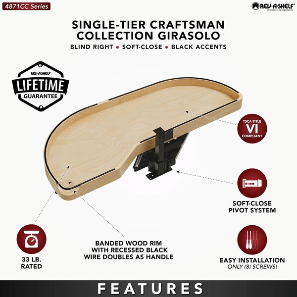 The 487CC Series Craftsman Collection "Girasolo" Blind Corner Optimizer by Rev-A-Shelf® offers a refined and sophisticated update to the classic Girasolo design. Crafted from maple with gracefully curved lines and soft edges, this innovative solution blends both elegance and practicality. The Girasolo glides effortlessly out of the cabinet on a soft-close pivot hardware system, eliminating the need for adjacent appliance clearance and maximizing accessibility. Designed for both right and left blind corner cabinet openings, it is available in multiple sizes and single or two-tier configurations, providing versatile storage options for hard-to-reach spaces.