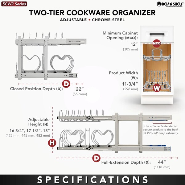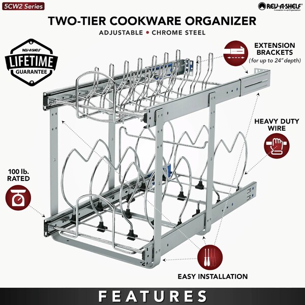 Revolutionize the way you store your pots, pans, and lids with Rev-A-Shelf's Two-Tier Cookware Organizer. The 5CW2 features independently operating shelves that accommodate a variety of cookware sizes and brands. The top tier organizes lids and the bottom tier features adjustable dividers to store a variety of large pots and pans. Made with a heavy duty chrome plated wire frame and 100 lb. rated full-extension soft-close ball-bearing slides. The bottom, side, and rear mounting provide you the sturdiness you expect and easy installation. Optional Door mounting kit available with the 5WB-DMKIT.