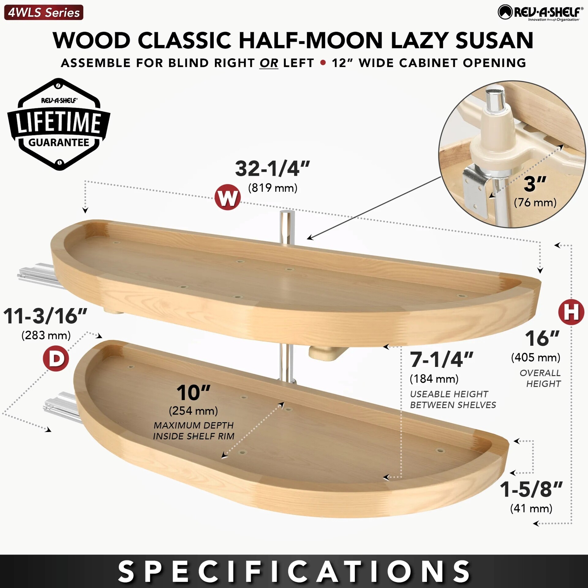 Rev-A-Shelf's 4WLS series half moon wood lazy susans are revered as the best on the market. Whether you are replacing an old unit or just adding a lazy susan to your base blind corner cabinet, you will not be disappointed with the high-quality construction and the durable pivot and pull hardware.