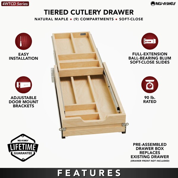 Double up your drawer space with Rev-A-Shelf's Two-Tiered drawer. This drawer box comes pre-assembled and ready to install into your existing cabinet drawer opening.