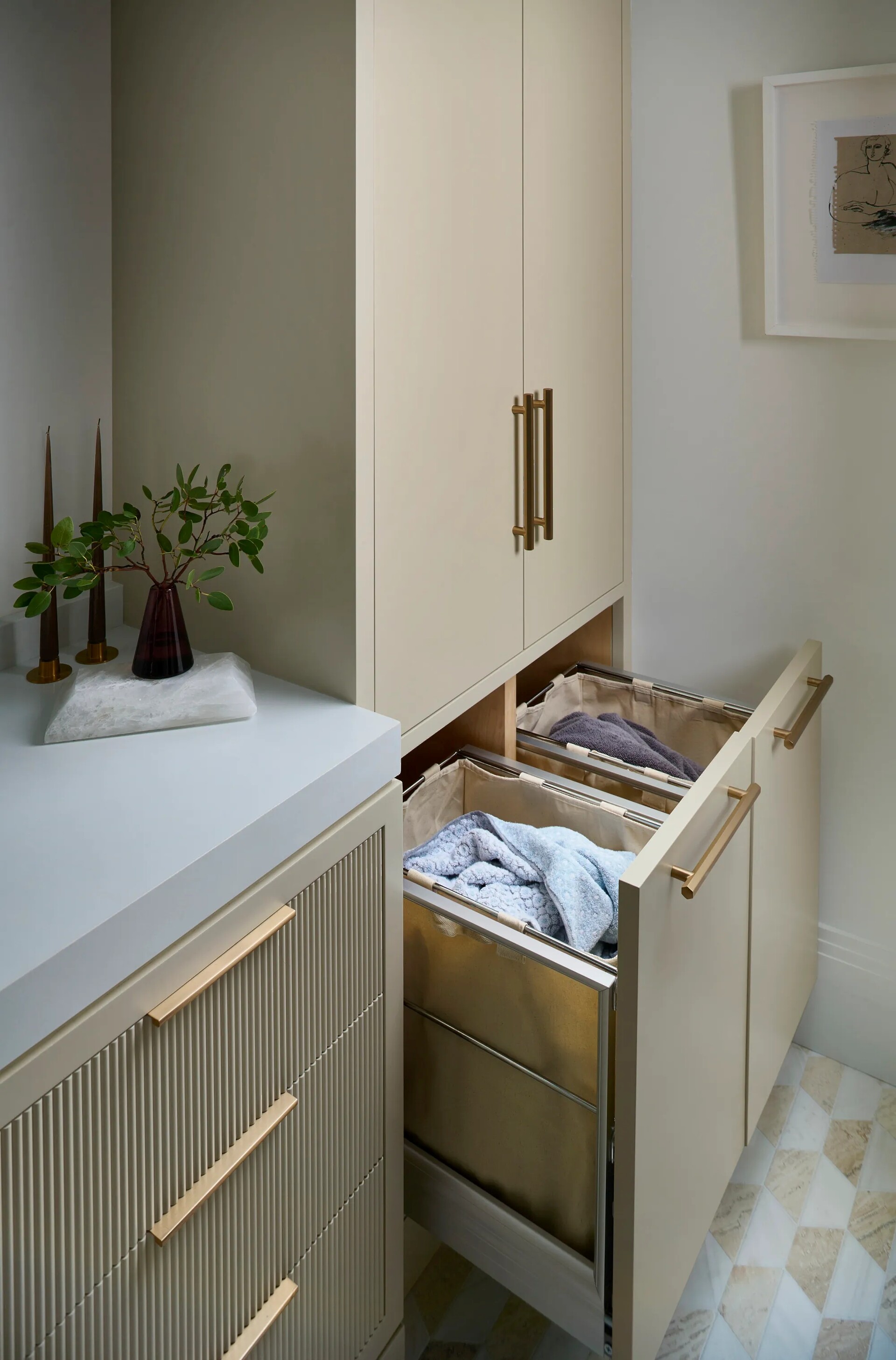 This beautiful pullout hamper is the only one in the industry that features a brushed aluminum frame with Rev-A-Shelf's patented soft-close/soft-open Rev-A-Motion technology. Designed for 18" base height vanity cabinets, the removable cloth bag makes laundry simple, and the adjustable door-mount brackets ensure a perfect fit every time.