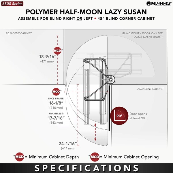 Every blind corner base cabinet can become functional with Rev-A-Shelf’s Half Moon Shelf System. The Half Moon Series includes standard and 90-degree hinge euro brackets and chrome-plated shaft and mounting brackets to help distribute the weight from the cabinet wall to the floor of the cabinet. In addition, the color coated shelf supports match the shelf and provide maximum deflection support.