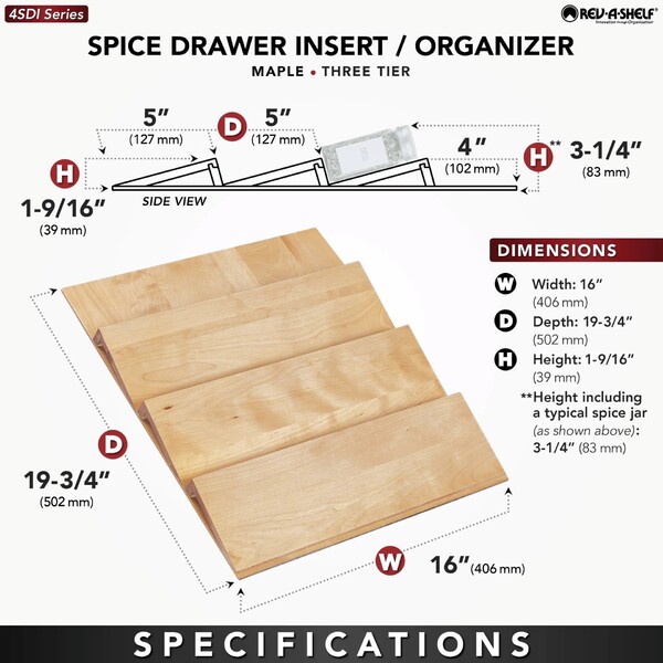 The popular Rev-A-Shelf 4SDI Spice Drawer Inserts are available in beautiful maple or walnut! Designed for 36" or smaller base cabinet drawers, this trim-to-fit insert features walnut or maple construction with a satin finish, one rear storage compartment and up to (3) tiers for all your spices. Combine with our 4WD Wood Dividers or use individually to fit your exact organizational needs.