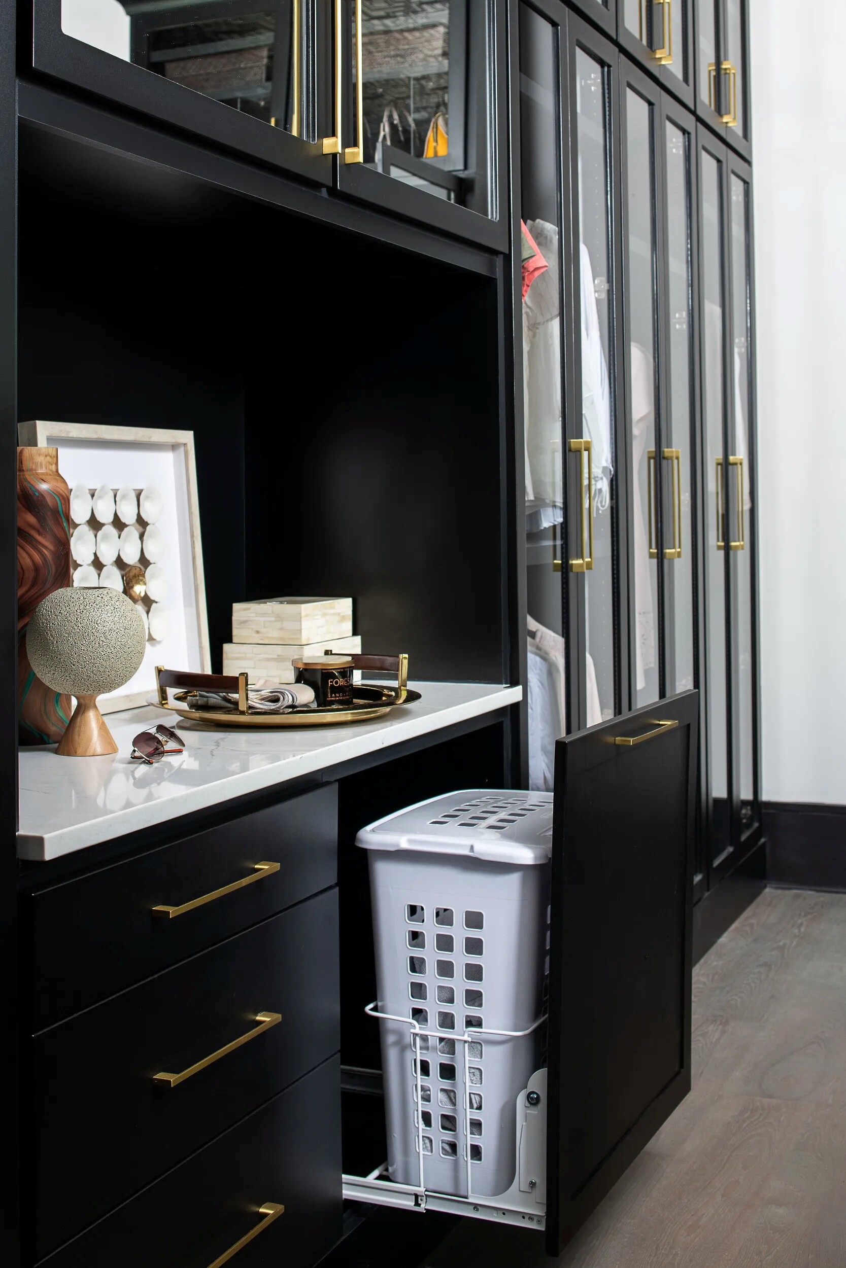 Keep dirty clothes from piling on the floor with Rev-A-Shelf's large Pullout Polymer Hamper. The HPRV Series features a shallow depth for closet and vanity applications, full-extension ball bearing slides, large capacity and installs with just four screws. This polymer hamper is available with or without a removable lid and with or without Rev-A-Shelf's classic door mount bracket kit.