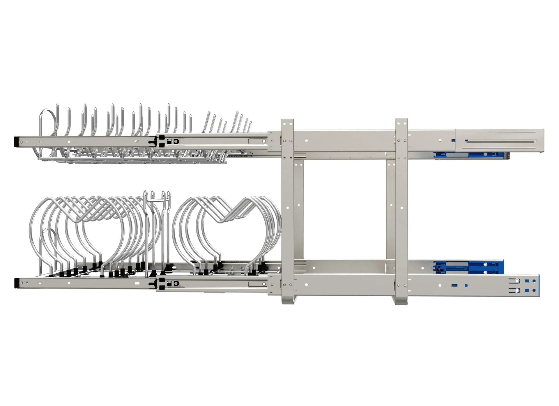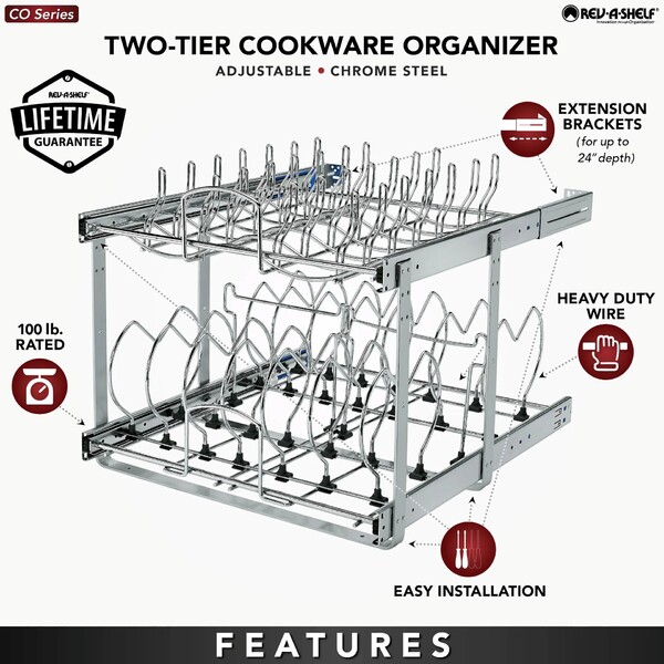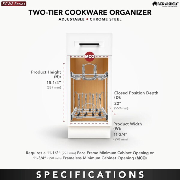 Revolutionize the way you store your pots, pans, and lids with Rev-A-Shelf's Two-Tier Cookware Organizer. The 5CW2 features independently operating shelves that accommodate a variety of cookware sizes and brands. The top tier organizes lids and the bottom tier features adjustable dividers to store a variety of large pots and pans. Made with a heavy duty chrome plated wire frame and 100 lb. rated full-extension soft-close ball-bearing slides. The bottom, side, and rear mounting provide you the sturdiness you expect and easy installation. Optional Door mounting kit available with the 5WB-DMKIT.