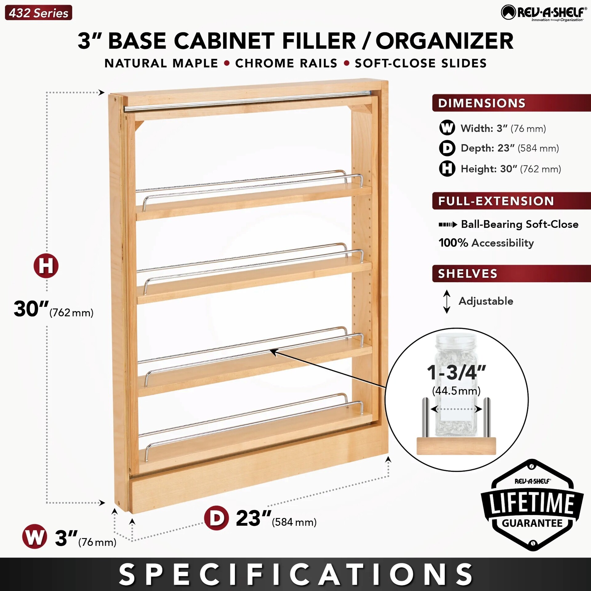 Create a functional storage space behind those decorative panels with this base filler cabinet. We didn’t’ just create another organizer...we created the whole cabinet that transforms decorative filler into useful storage pullouts. The 432 is available for 3”, 6” and 9” base cabinet applications and features adjustable shelves with chrome rails, full-extension ball bearing slides and our three slide design provides the most stable function on the market.