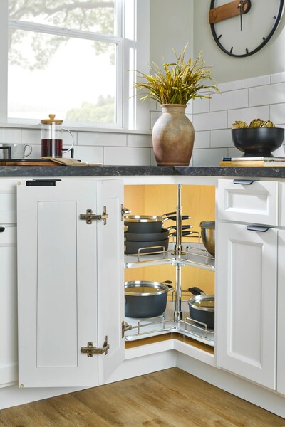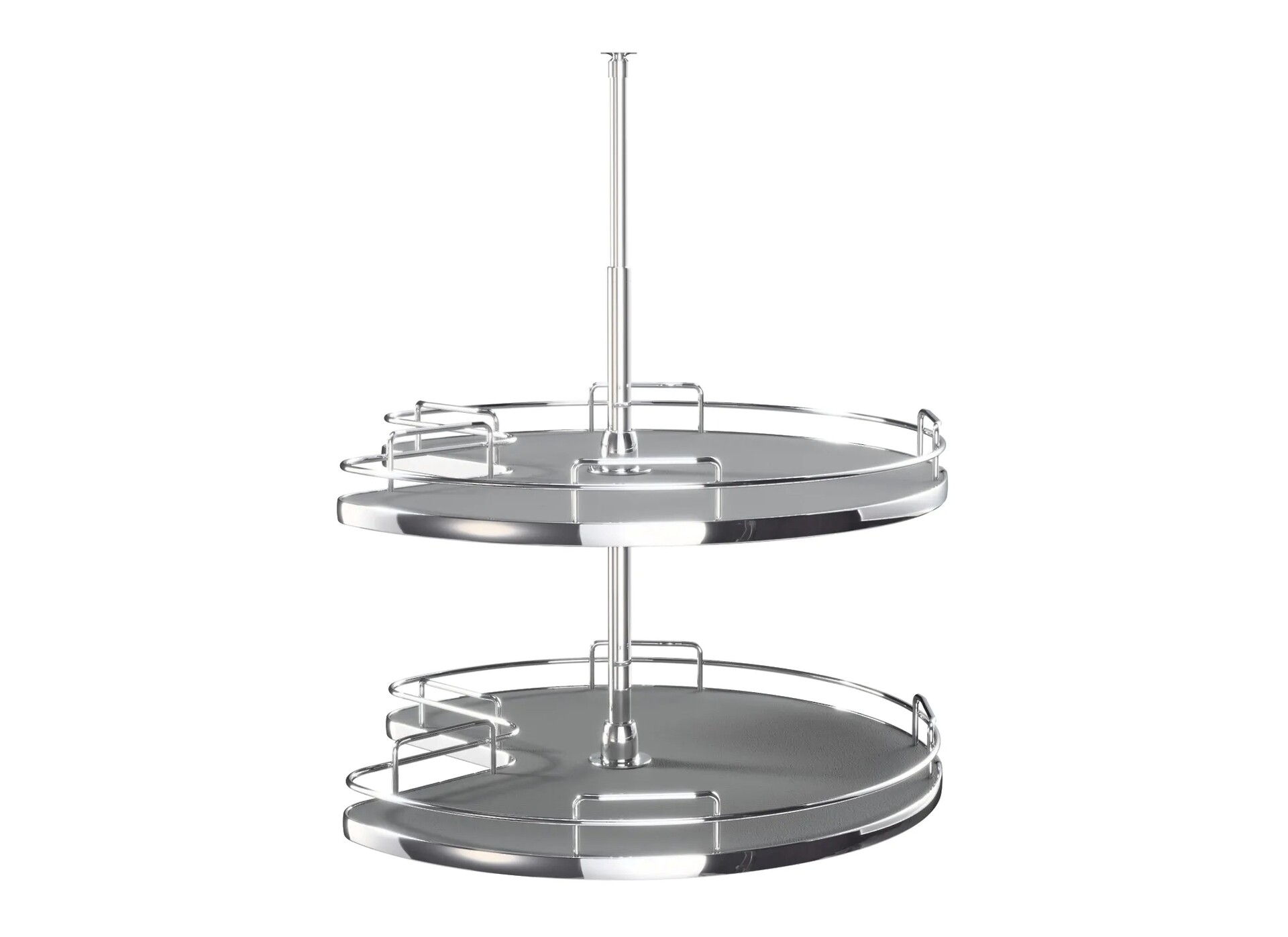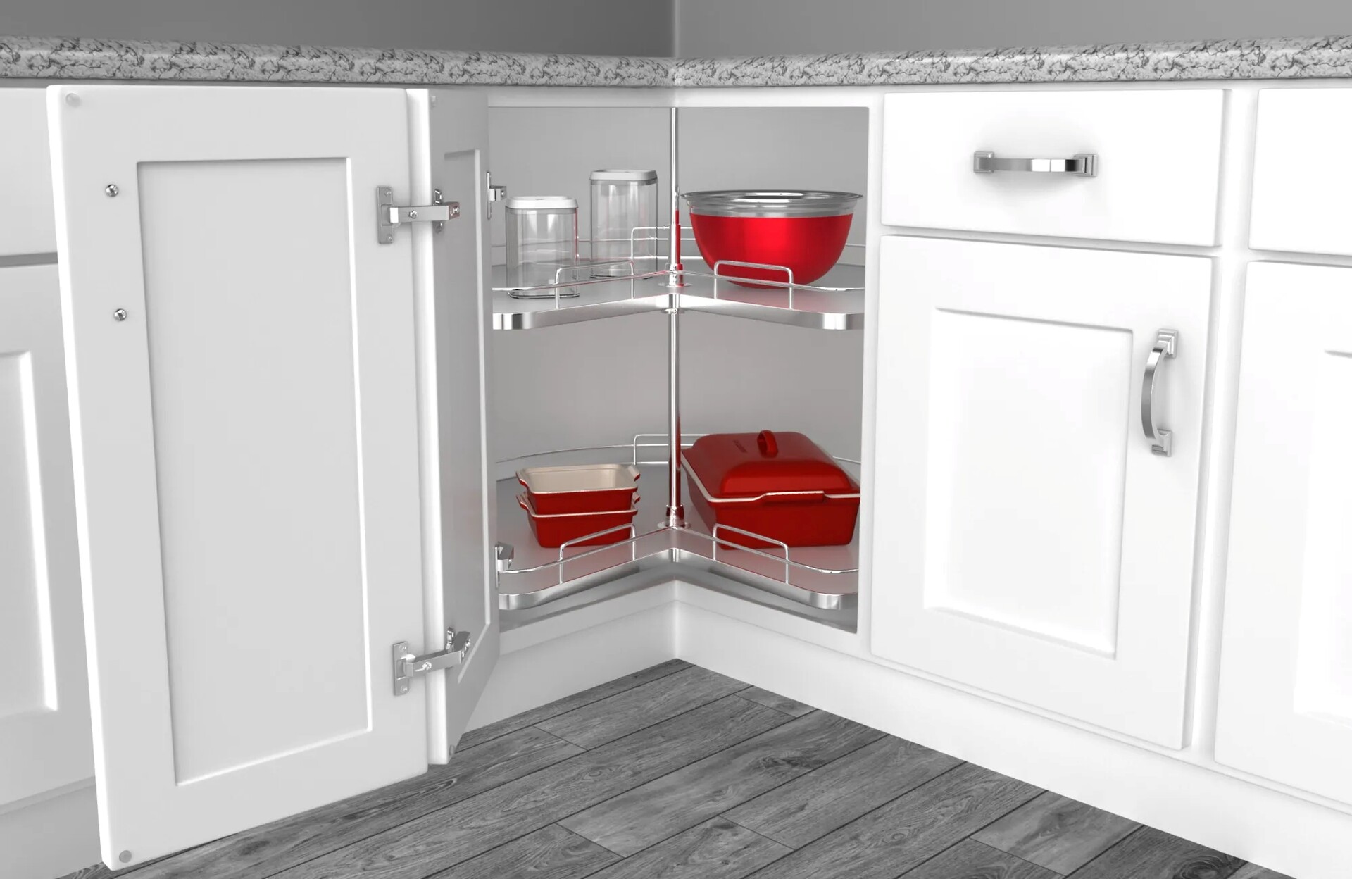 Make the most of that tricky corner cabinet space with the Rev-A-Shelf® 53-472 Series Solid Bottom Two-Tier Kidney-Shaped Lazy Susan. Available in two sizes, these two-tier Lazy Susans include a telescoping shaft with independently rotating hardware for a perfect fit and easy access to your angled corner cabinet. Choose from multiple stylish finishes!
