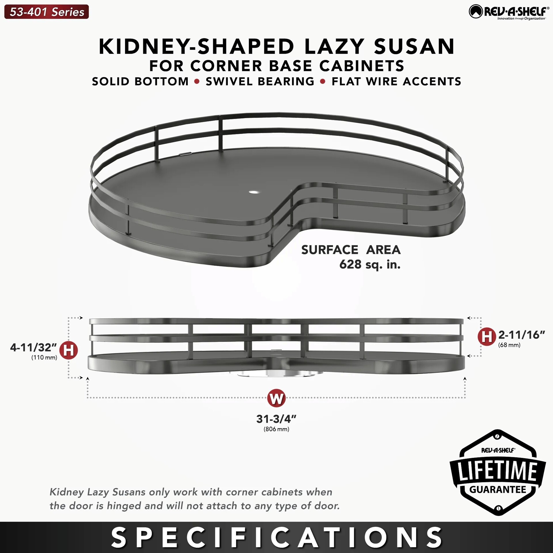 Maximize your kitchen's efficiency with the Rev-A-Shelf® 53-401 Series Kidney-Shaped Lazy Susan—an innovative solution for corner cabinet storage. These Lazy Susan shelves feature durable aluminum swivel bearings with a built-in stop for smooth rotation and effortless access. Available in multiple finishes and widths, they offer both style and functionality to transform your cabinet space.