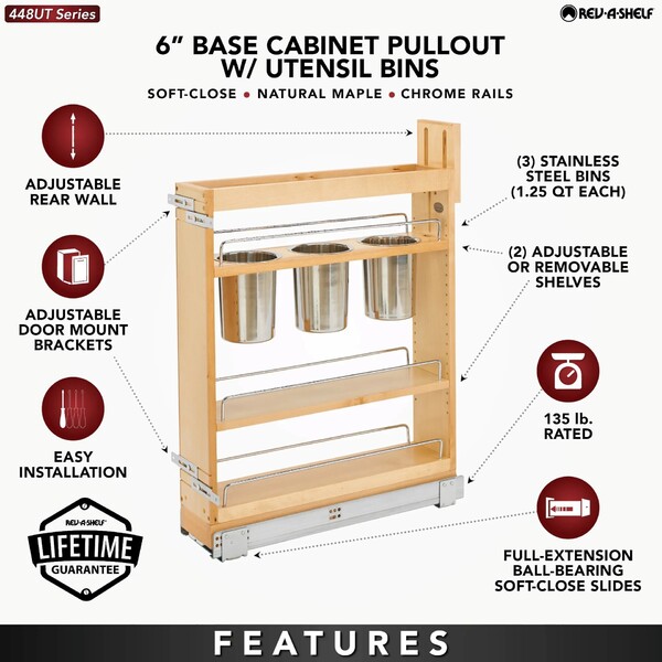 Rev-A-Shelf's beautiful base organizers feature adjustable shelves with chrome rails to help keep everything in its place. Stop digging through drawers for utensils and say goodbye to unsightly, space monopolizing counter bins with the 448UT pullout designed specifically for storing a multitude of utensils. Units glide out on the BLUMOTION soft-close slide system, which is some of the industry best slides. Door mounting is easy with our patented door mount brackets that provide up to 5 inches of flexibility for trouble free installation on any door style.