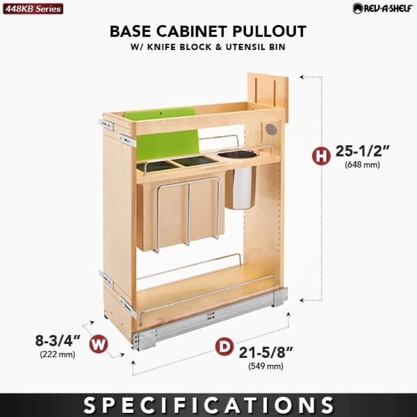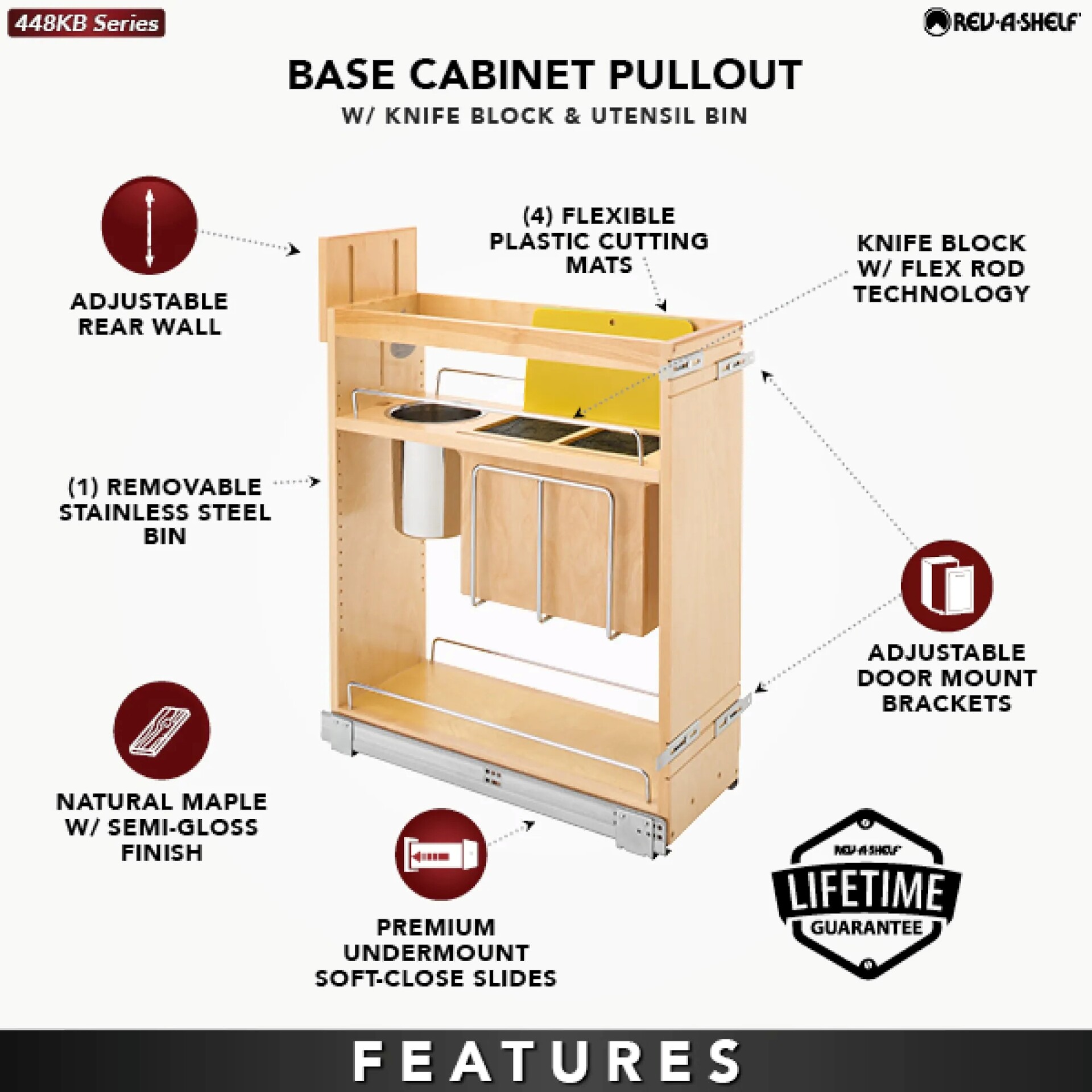 Every great chef knows that you are only as good as your knives but having so many sizes and brands makes storing them a nightmare. That is no longer a concern with our 448KB Organizer with Blumotion Soft-Close. This unit features two universal knife inserts, stainless steel utensil bin, and adjustable shelf for lower storage.