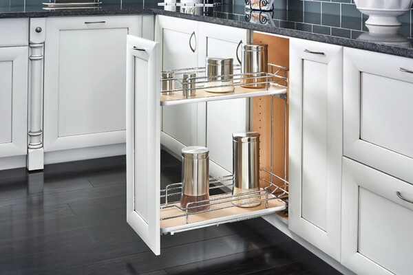 Bring the elegance with this chic design into your home with the Rev-A-Shelf 5322 Series. This Two-Tier Base Organizer combines clean lines, modern chrome or orion gray flat wire accents, and your choice of luxurious gray, maple or orion gray shelving surfaces to create a striking piece of organizational technology. Features patented door mount brackets, Blum soft-close slides system and heavy duty construction.