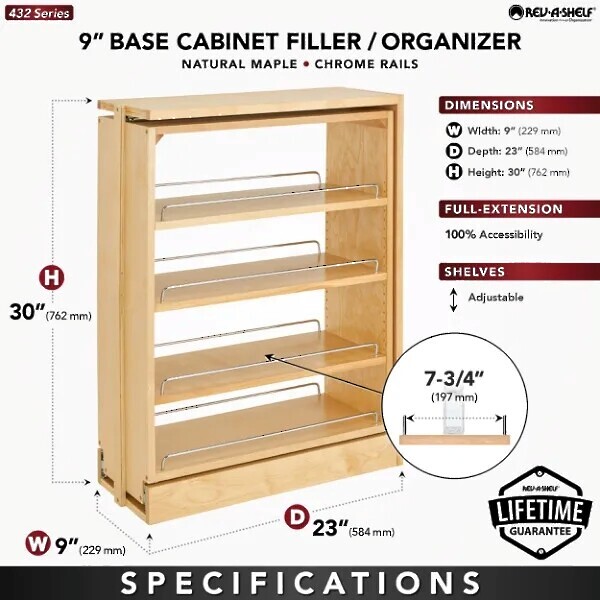 Rev-A-Shelf - 9" Filler Pullout Organizer with Wood Adjustable Shelves