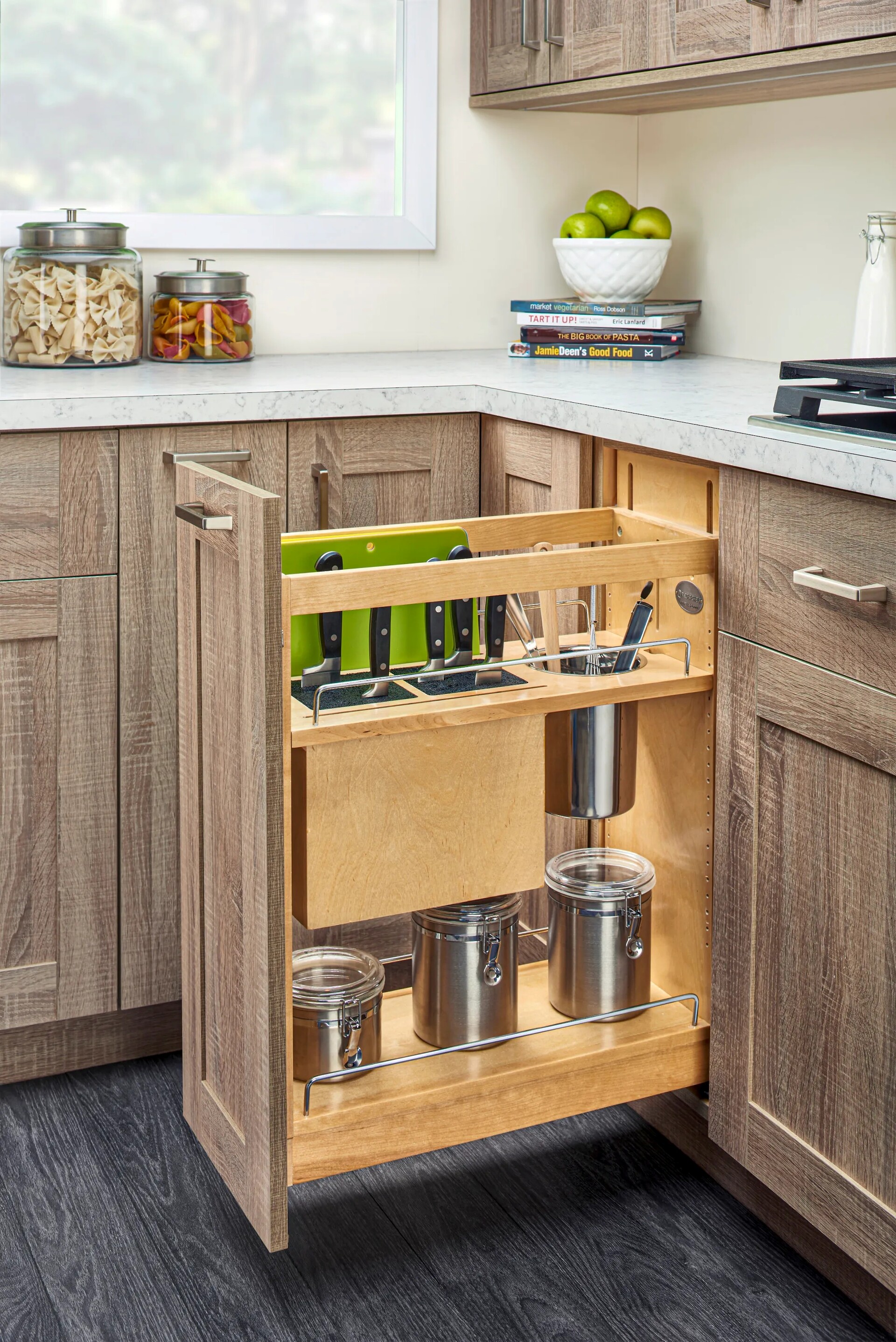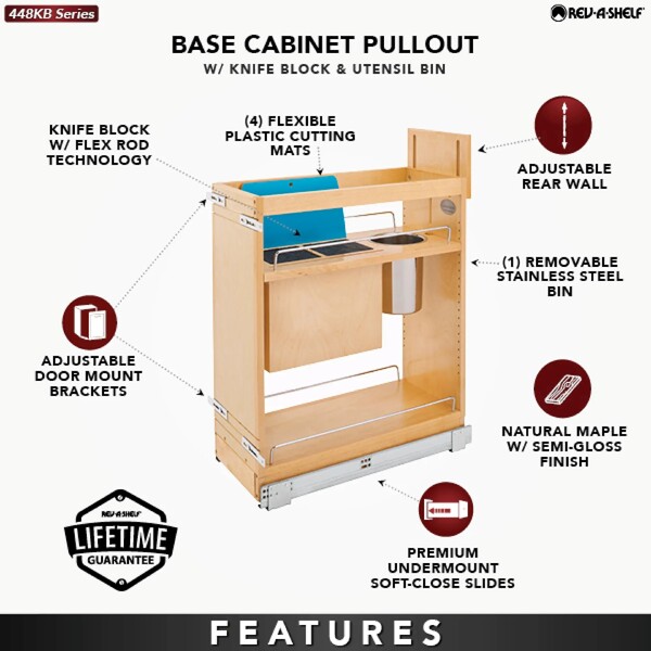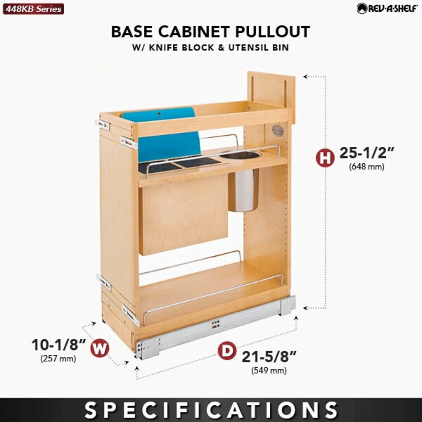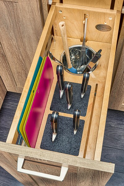 Every great chef knows that you are only as good as your knives but having so many sizes and brands makes storing them a nightmare. That is no longer a concern with our 448KB Organizer with Blumotion Soft-Close. This unit features two universal knife inserts, stainless steel utensil bin, and adjustable shelf for lower storage.
