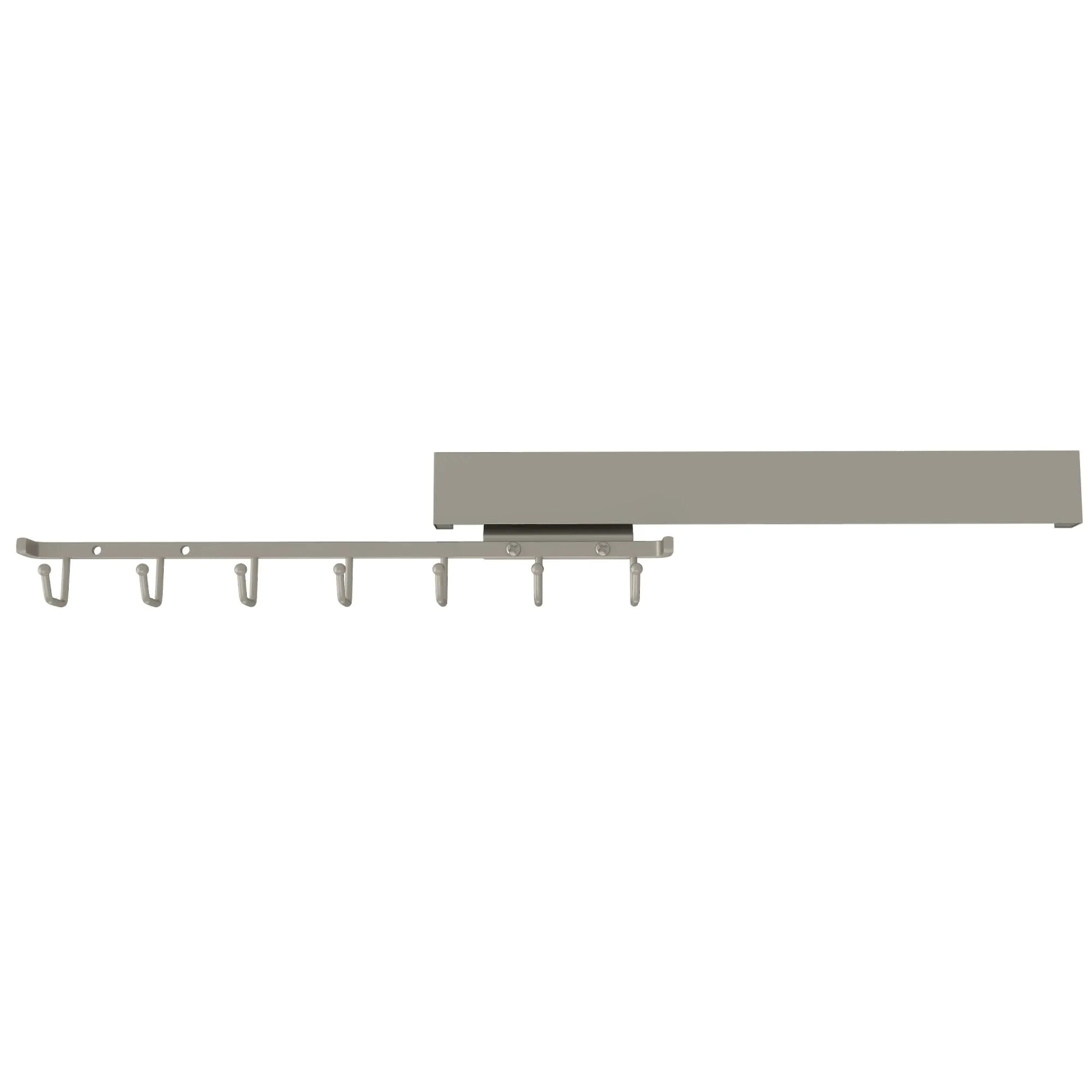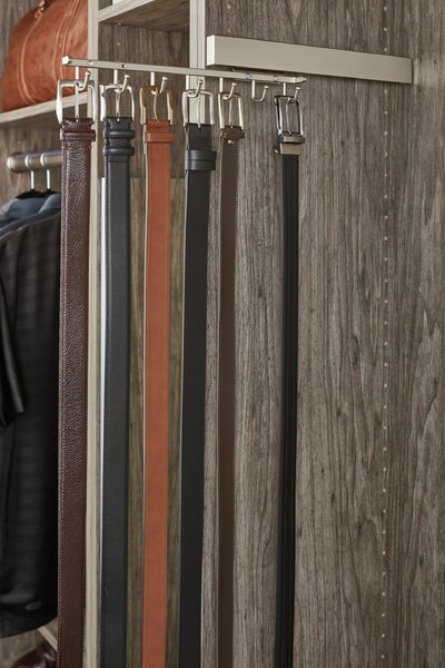 Offering easy to reach storage for your belt, the Deluxe Belt Rack complements our other Deluxe Accessories for storage of ties, scarves, and more. It stores against a closet panel and then slides out when needed from behind clothes on full-extension, ball-bearing, steel slides. See your collection of belts on this elegant rack featuring 7 hooks on a steel frame. It is available for 14" or greater depth panels in several luxurious finishes to match Sidelines By Rev-A-Shelf's other accessories.