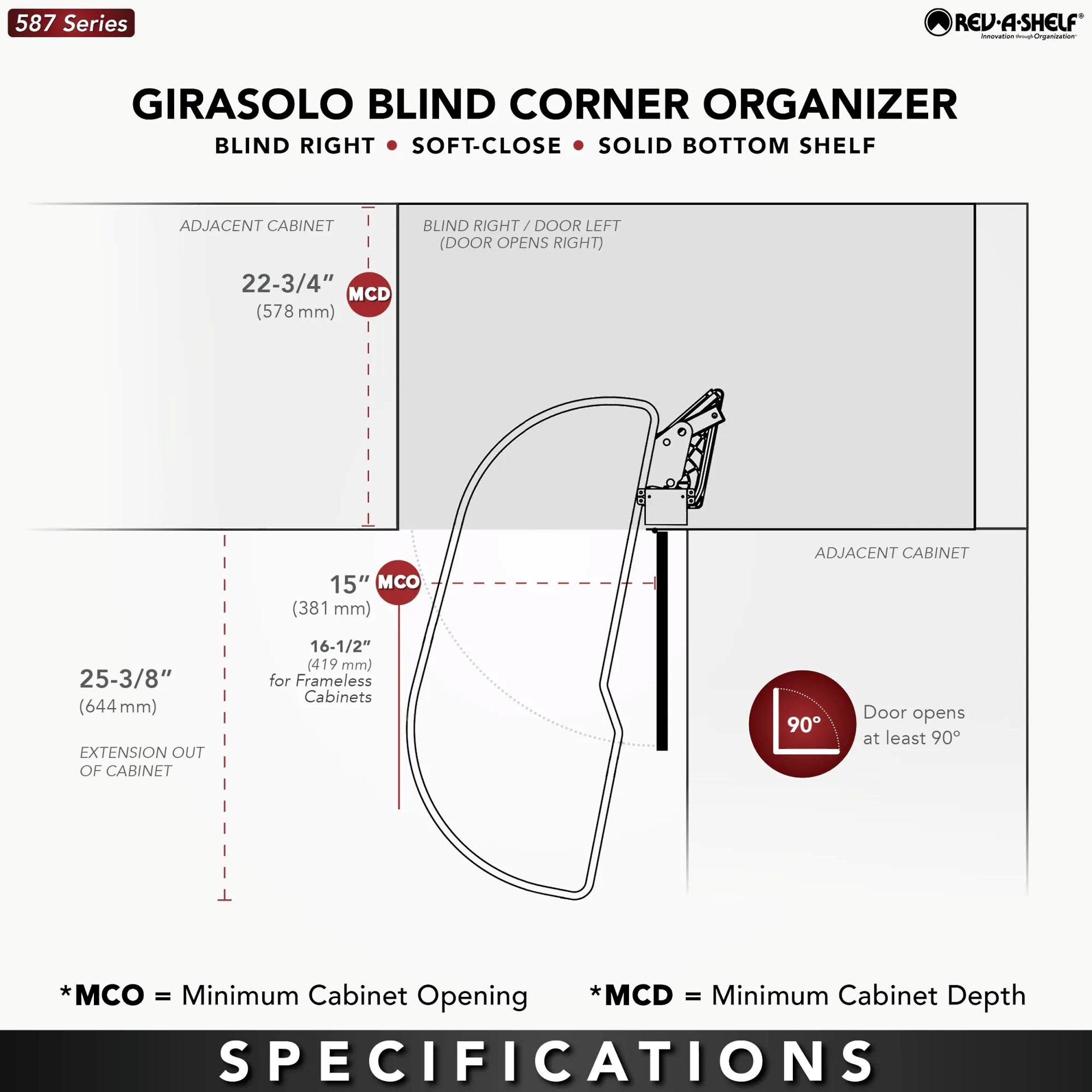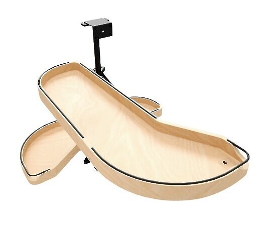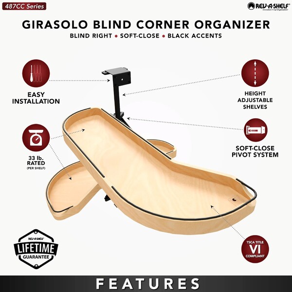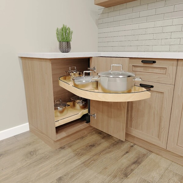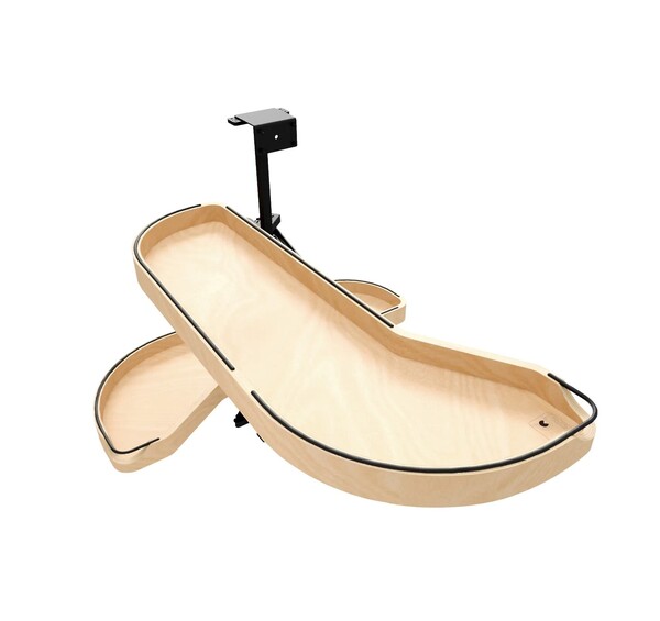 The 487CC Series Craftsman Collection "Girasolo" Blind Corner Optimizer by Rev-A-Shelf® offers a refined and sophisticated update to the classic Girasolo design. Crafted from maple with gracefully curved lines and soft edges, this innovative solution blends both elegance and practicality. The Girasolo glides effortlessly out of the cabinet on a soft-close pivot hardware system, eliminating the need for adjacent appliance clearance and maximizing accessibility. Designed for both right and left blind corner cabinet openings, it is available in multiple sizes and single or two-tier configurations, providing versatile storage options for hard-to-reach spaces.