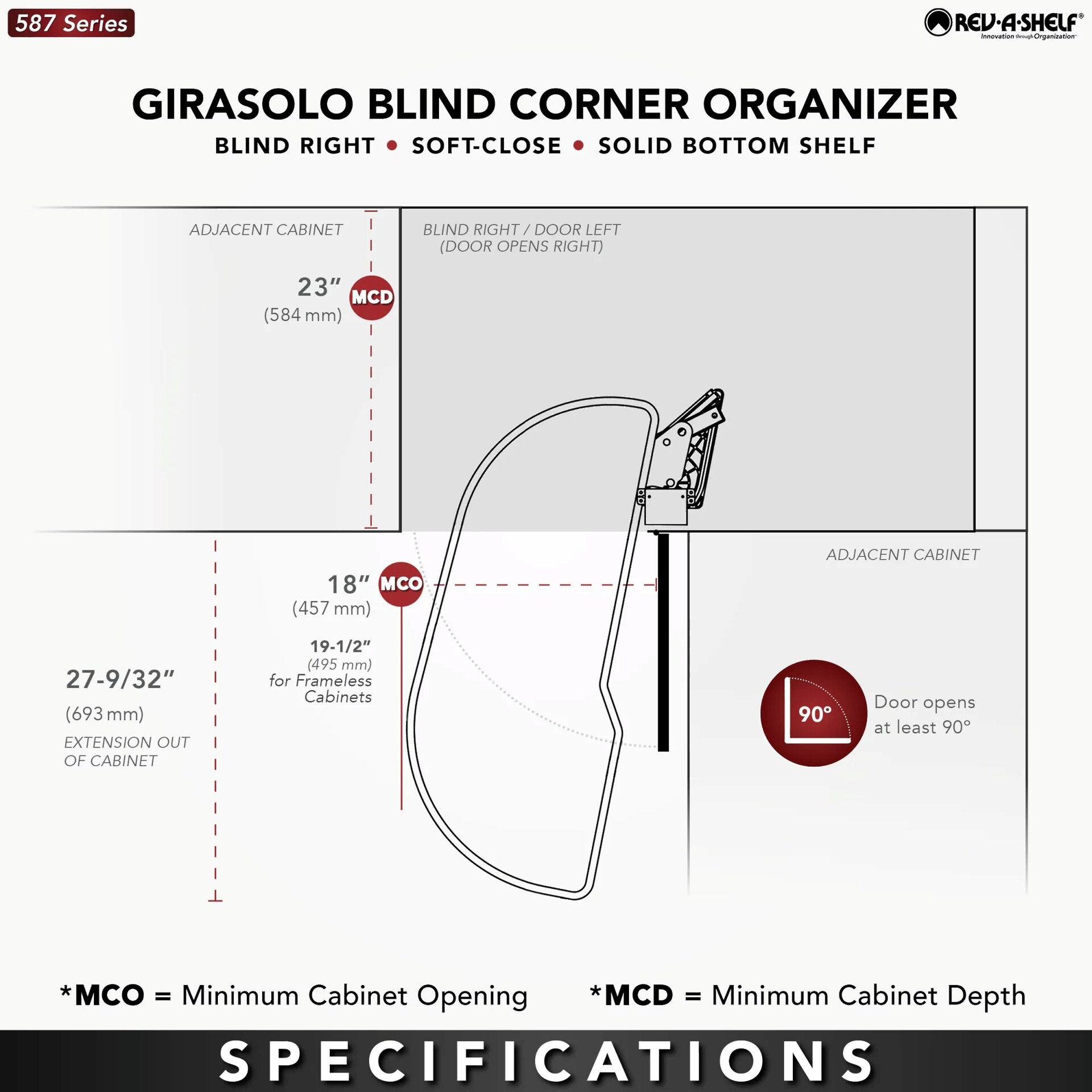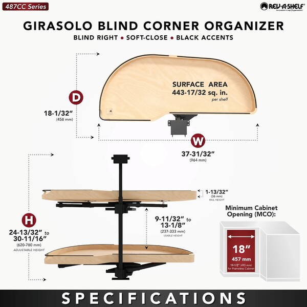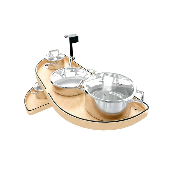 The 487CC Series Craftsman Collection "Girasolo" Blind Corner Optimizer by Rev-A-Shelf® offers a refined and sophisticated update to the classic Girasolo design. Crafted from maple with gracefully curved lines and soft edges, this innovative solution blends both elegance and practicality. The Girasolo glides effortlessly out of the cabinet on a soft-close pivot hardware system, eliminating the need for adjacent appliance clearance and maximizing accessibility. Designed for both right and left blind corner cabinet openings, it is available in multiple sizes and single or two-tier configurations, providing versatile storage options for hard-to-reach spaces.