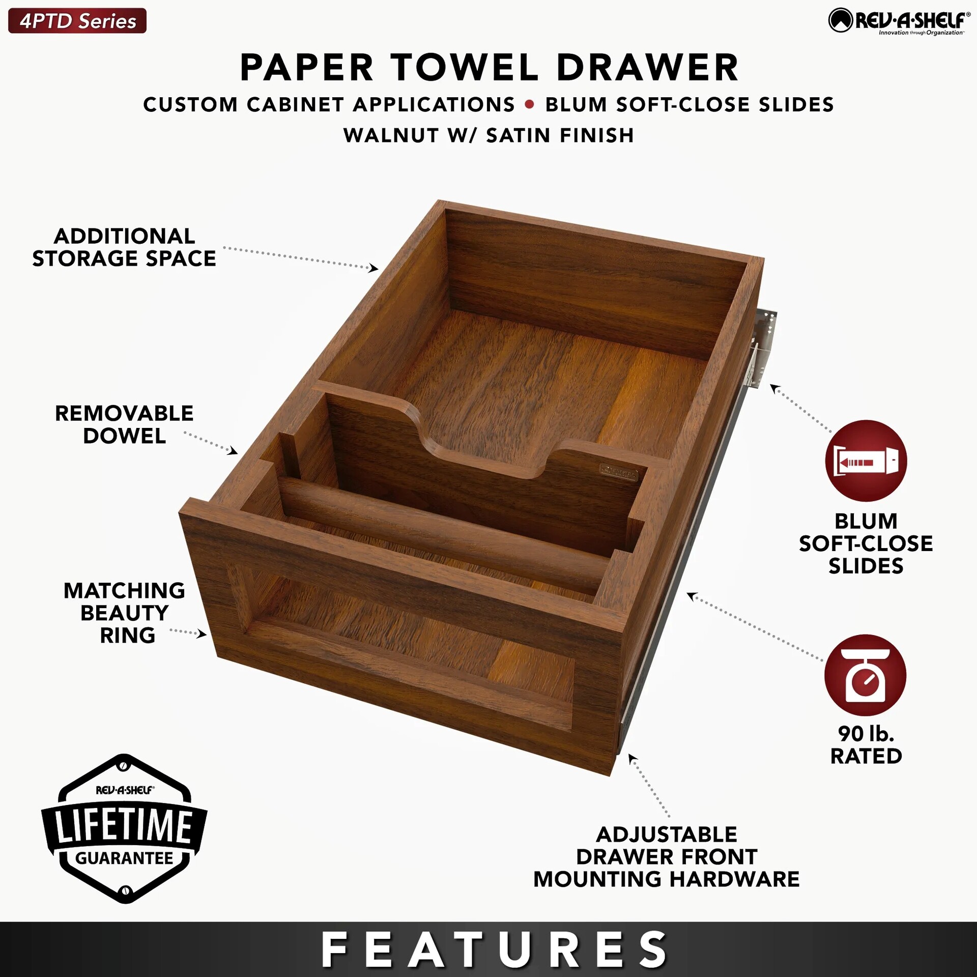 Reduce clutter on your countertops while still enjoying easy access to your paper towels with the 4PTD Series! This innovative drawer system offers ample storage space and a removable dowel for easy refilling.