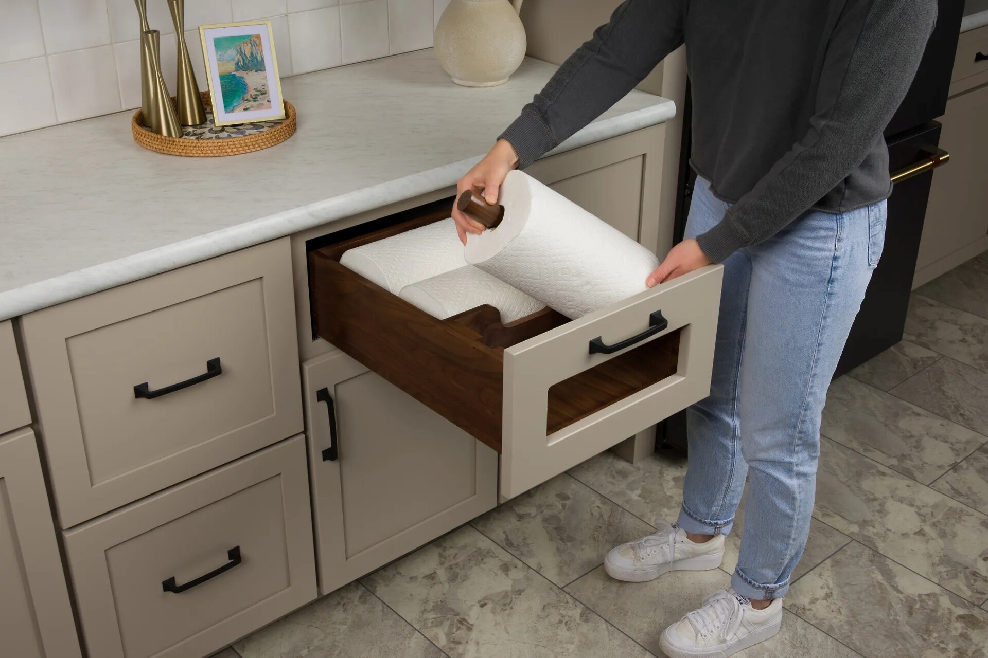 Walnut Paper Towel Drawer System w/ BLUM Soft-Close Slides for 18 inch Base Cabinets